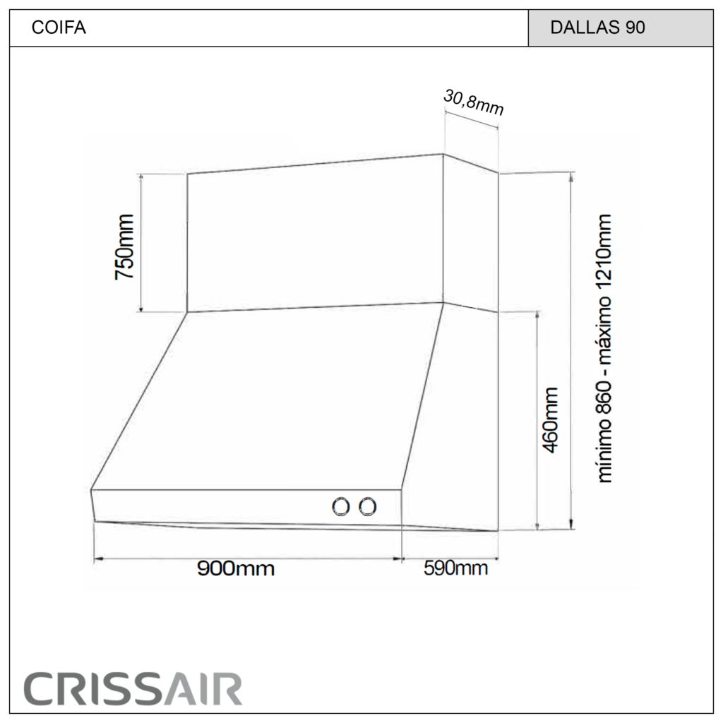 A coifa Dallas possui as medidas de 900 x 590mm, vazão de 1.500m³/HS com 3 velocidades e ruído de 65dBa. Iluminação em LED, 1 motor de 238W e pré-filtro inercial para maior eficiência.