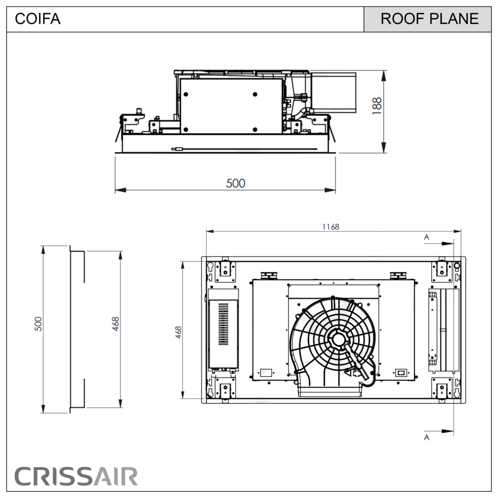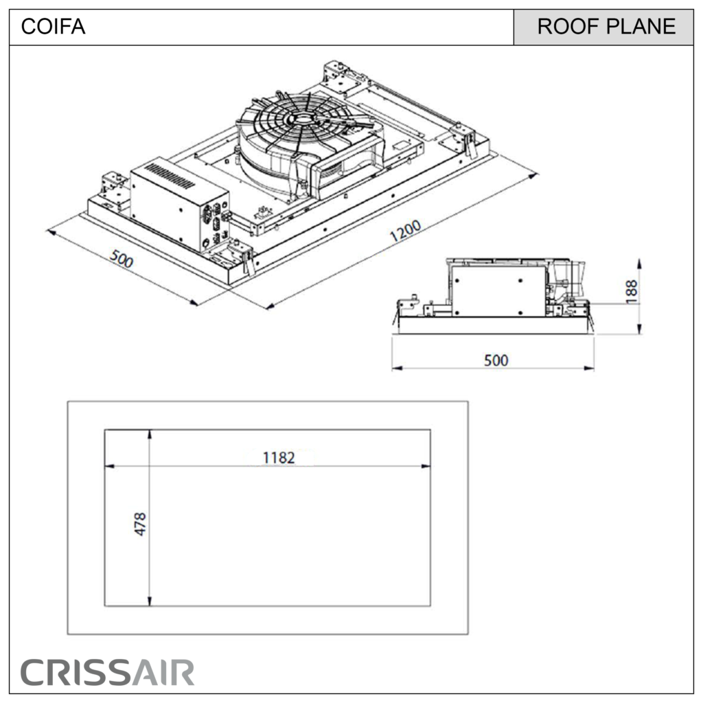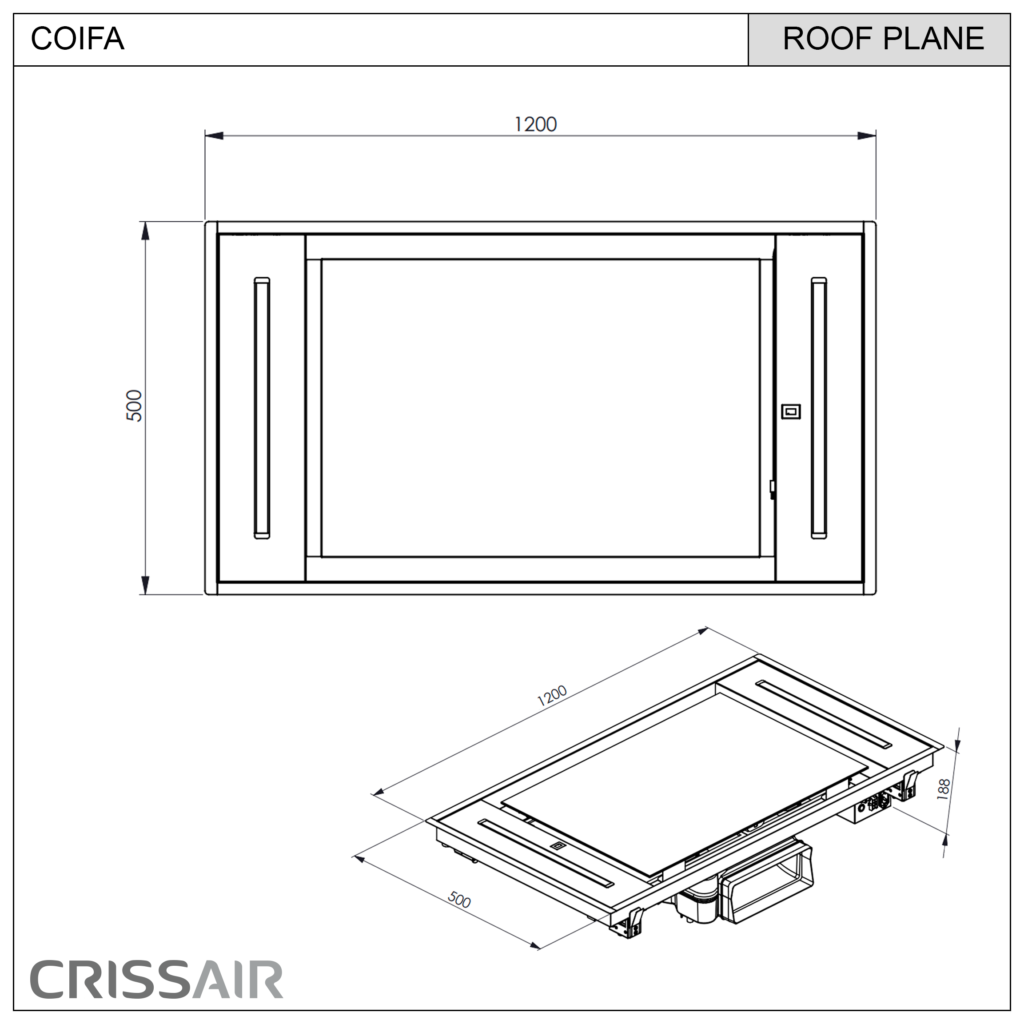 A coifa Roof Plane possui as dimensões de 1.200 x 500mm, instalação ilha embutida, aspiração perimetral de 1.200 m³/h, 3 velocidades, controle remoto, acabamento em aço inox, iluminação LED de 2X6W, filtro de alumínio. A coifa Roof Plane pode funcionar por exaustão.
